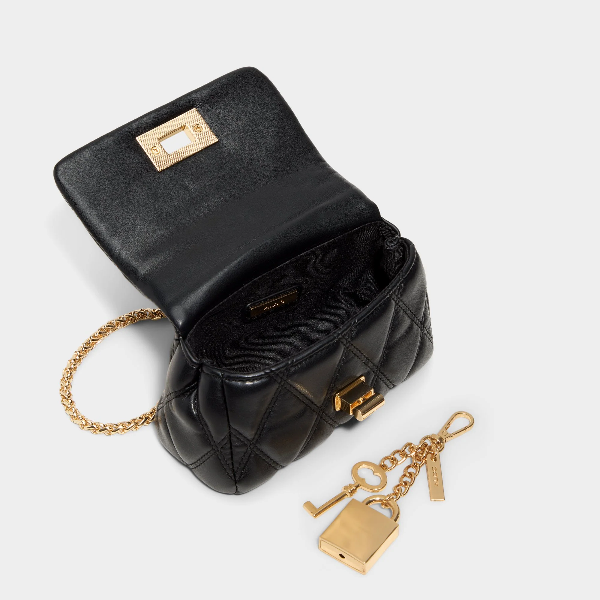 Plush diamond-quilted leather gives this shoulder bag quiet shine, with a gleaming turn-lock and a playful padlock-and-key charm that guard essentials in style while adding a touch of quiet drama. Sling it over blazer-and-denim for coffee catch-ups, or tuck under satin slips at rooftop parties to seal the look with easy confidence.
